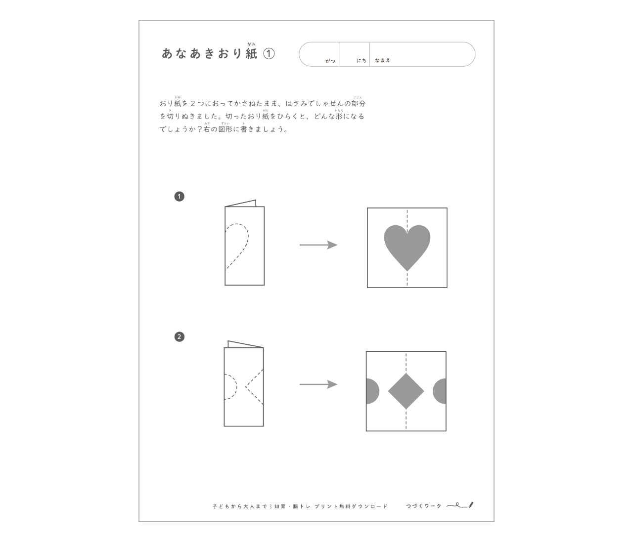 おり紙を2つにおってかさねたまま、はさみでしゃせんの部分を切りぬきました。切ったおり紙をひらくと、どんな形になるでしょうか?右の図形に描きましょう。下の画像を押すとPDFが開きます。