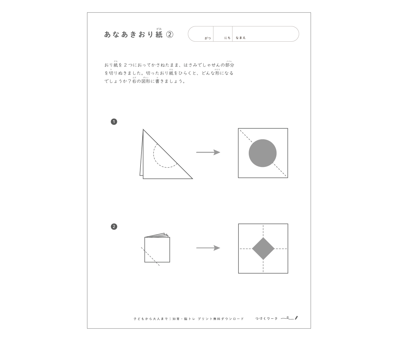 おり紙を2つにおってかさねたまま、はさみでしゃせんの部分を切りぬきました。切ったおり紙をひらくと、どんな形になるでしょうか?右の図形に描きましょう。下の画像を押すとPDFが開きます。