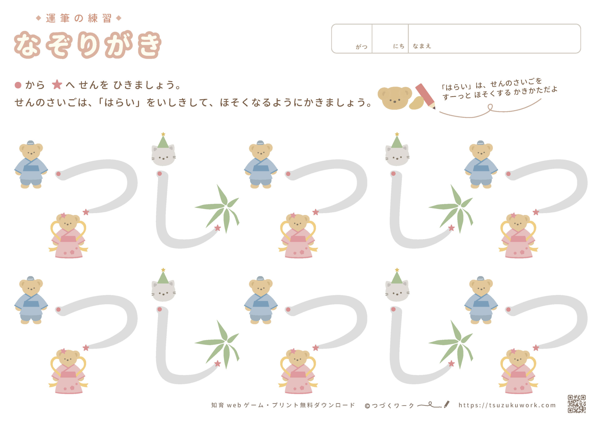 今回は、ひらがなの「はらい」が練習できる運筆プリントをお届けします。
